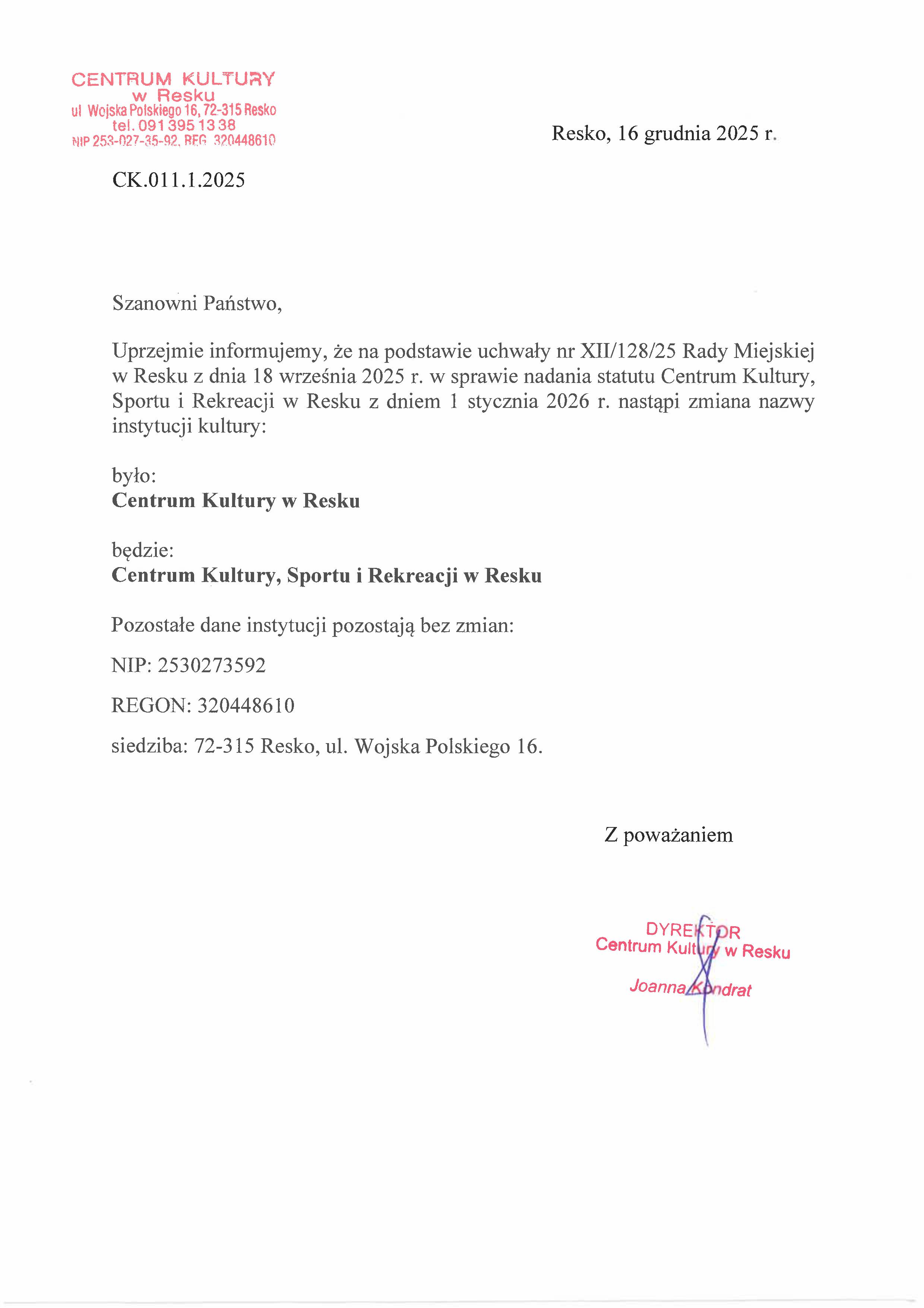 Centrum Kultury zmienia nazwę na Centrum Kultury, Sportu i Rekreacji.